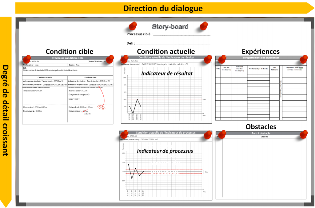 Puis elle pensa à son cycle de coaching avec Joe. Il lui avait été difficile de suivre ses remarques lorsqu’il avait présenté les résultats de son observation du processus d’hier. Pour cela, il avait disposé des croquis partout sur le storyboard. Un schéma fonctionnel du processus, un tableau de contrôle de 20 cycles et un schéma spaghettis pour le mouvement des opérateurs. Il allait et venait entre ces diagrammes et le formulaire de la condition cible. Denise avait du mal à s’orienter sur le tableau. D’une manière ou d’une autre, nous devons apporter une certaine structure au storyboard, pense-t-elle.