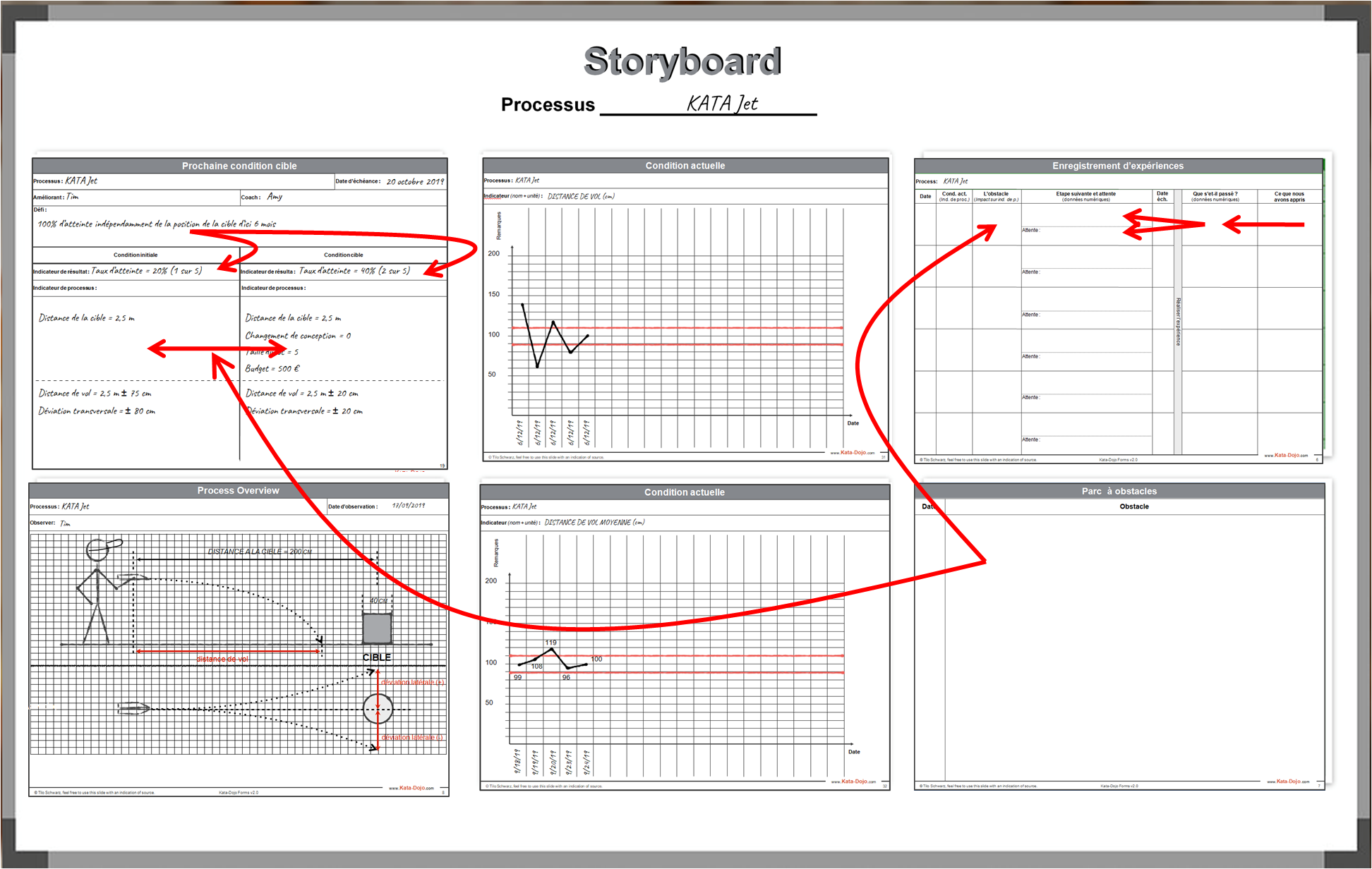 En haut à gauche, le formulaire de condition cible, y compris le diagramme de processus et les esquisses du modèle de processus réel et souhaité situé en dessous. Au centre, en haut, le graphique de l’indicateur de résultat, en dessous, le graphique de l’indicateur de processus. En haut à droite, l’enregistrement des expériences avec le parc à obstacle en dessous.