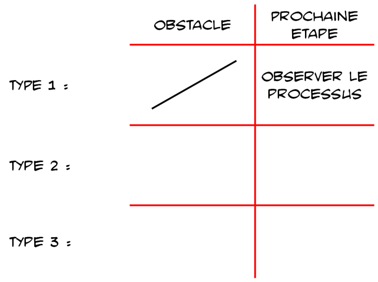 Depuis que Denise et ses chefs d’équipe, Joe et Mark ont commencé à faire la distinction entre un obstacle de mise en œuvre et un obstacle de processus (lire l’épisode 9 pour plus de détails), ils ont décidé de ne noter que l’obstacle de processus actuellement traité dans l’enregistrement des expériences. Ils avaient également pris l’habitude de tracer une ligne en pointillés dans la colonne d’obstacles tant que le prochain obstacle de processus à traiter était inconnu. Dans un tel cas, la prochaine étape logique serait une expérience de type 1 – trouver des obstacles de processus à résoudre, pensa Denise. Elle remplit la première ligne de son tableur.