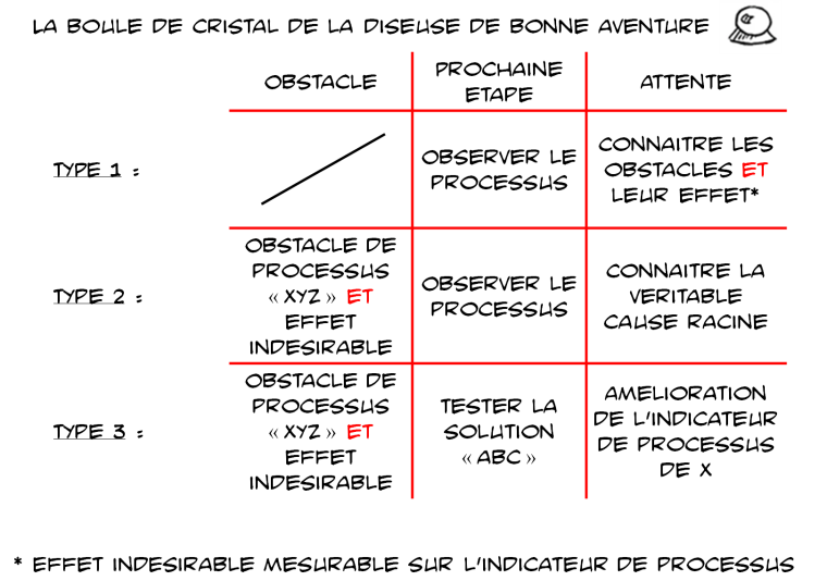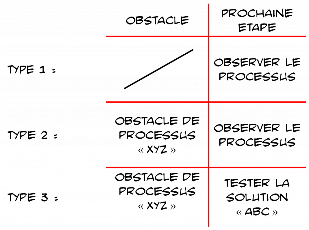 Ainsi, pour les expériences de type 2, une observation ou un test visant à rechercher la cause racine d’un obstacle, l’attente était bien entendu « nous connaissons la cause racine ». Comme ce matin, pensa Denise. C’est précisément ainsi que Joe avait formulé l’attente de sa prochaine étape. Et cette étape était une expérience de type 2, comme Denise était heureuse de le reconnaître. Sa petite table semblait bien fonctionner.