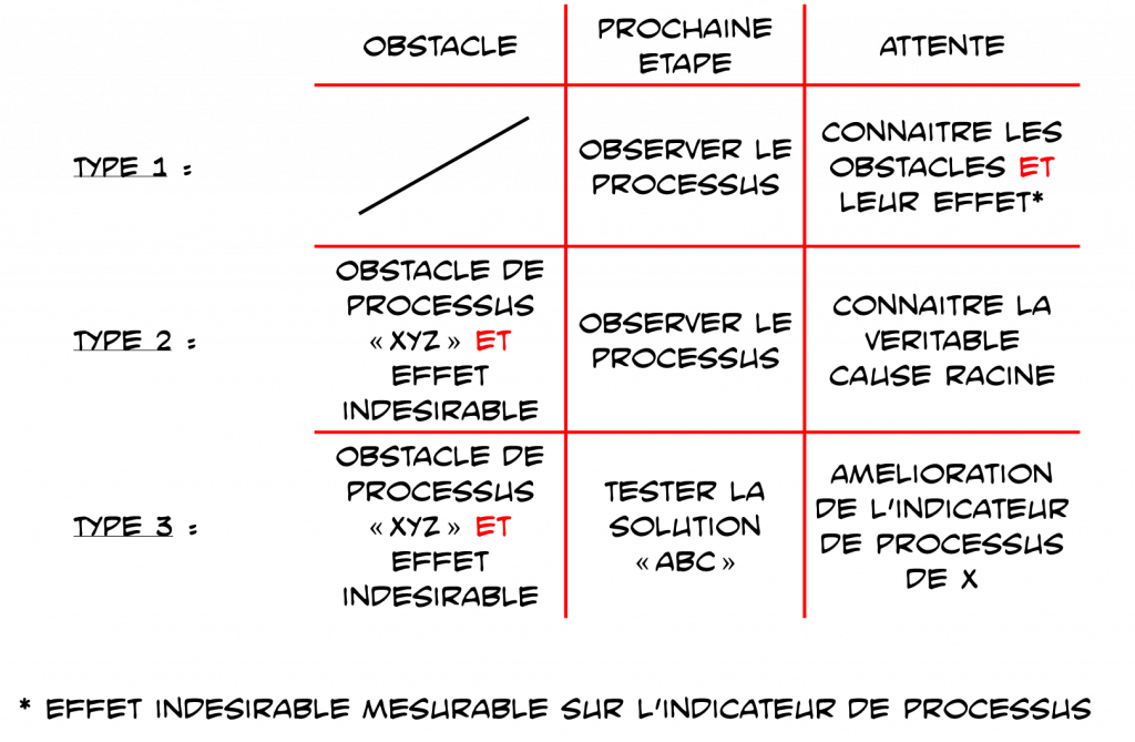 Denise passe au type 3 dans sa pensée : Nous testons maintenant une solution pour supprimer l’obstacle abordé. L’attente serait alors numérique : l’indicateur de processus s’améliorera de la valeur de l’effet indésirable si l’obstacle est effectivement levé. Ainsi, non seulement le type d’étape suivante, le type 1, 2 ou 3, dépend de notre compréhension de l’obstacle, mais également nos attentes. Denise ajoute la colonne « attente » à son croquis avec les trois types d’expériences.