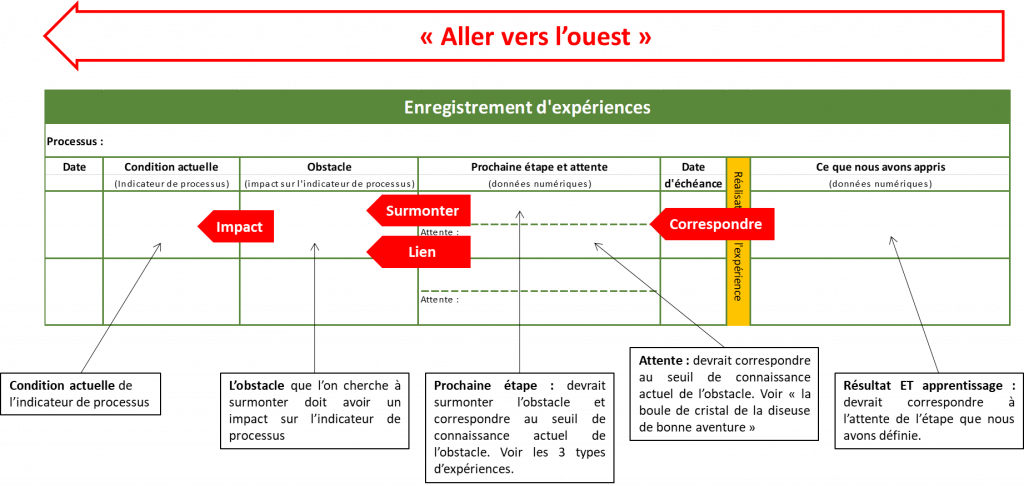 La prochaine étape doit correspondre à l’obstacle. C’est là que le modèle de trois types d’expériences est utile. En outre, les attentes devraient correspondre au type d’étape que nous menons. Tu pourrais même aller plus loin, réalise Denise. L’apprentissage ou la découverte, ce dont nous parlons lorsque nous demandons « qu’avez-vous appris de la dernière étape », devrait correspondre à l’étape et aux attentes. C’est beaucoup de choses à surveiller, Denise fait une pause, comment pourrais-je avoir un rappel pour ça ? Soudain elle a une idée. Peut-être pourrions-nous intégrer un indice pour le coach dans l’enregistrement des expériences. Elle sort un enregistrement d’expérimentation vide, le coupe le long des colonnes et les range dans l’ordre de la logique ci-dessus.