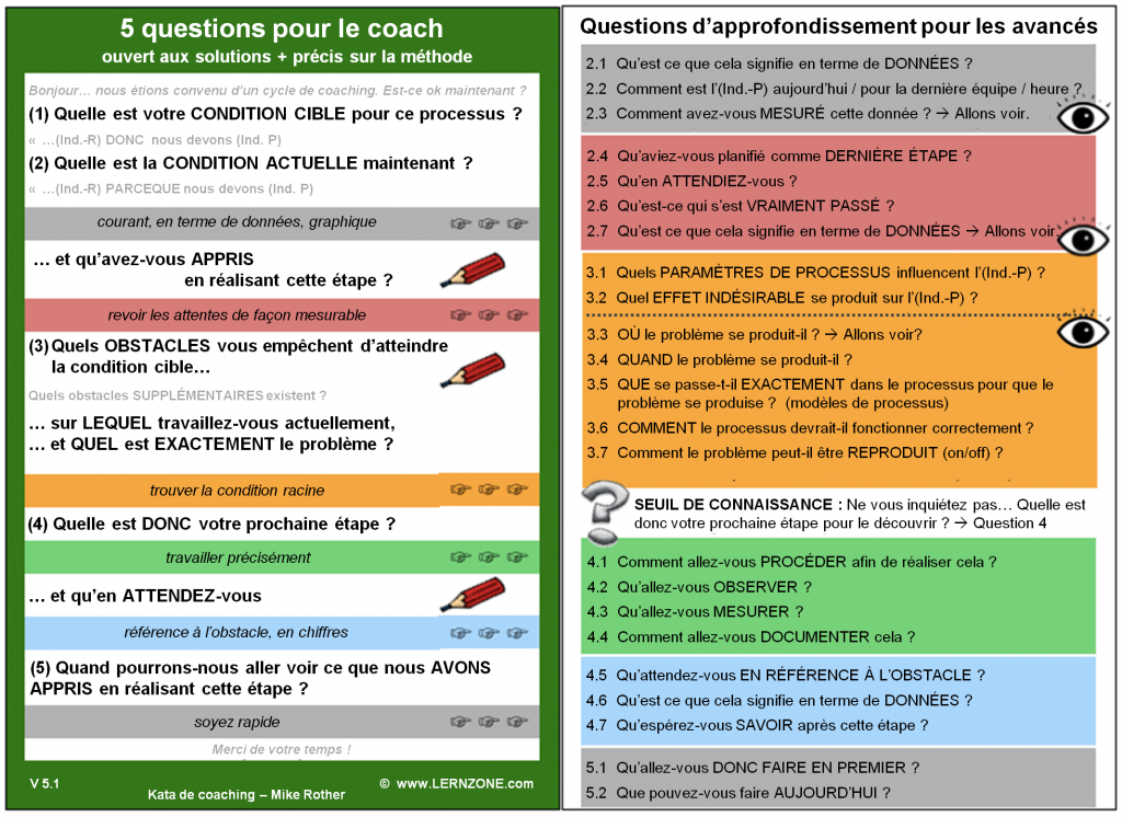 La session a été assez longue, nous allons donc garder le reste pour la semaine prochaine. Vous pouvez trouver la carte avec les questions d’approfondissement que Denise et Jason ont développées ci-dessous. Si vous le souhaitez, vous pouvez l’imprimer et la tester. Il y a plus de questions plus approfondies à ce sujet que nous en avons discutées jusqu’à présent, nous en ferons un suivi dans les prochains épisodes. La semaine prochaine : Découvrez pourquoi le côté gauche de la carte utilisée par Denise est légèrement différent des questions initiales du kata de coaching. De plus, j’espère discuter enfin du multi-outil pour le coach que j’avais promis dans l’épisode 14.