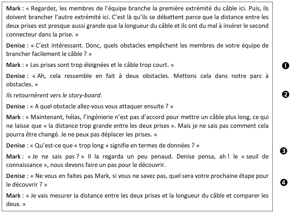 - En réalité, « câble trop court » et « prises trop éloignées » ne sont pas encore des obstacles précis. Cependant, Mark propose une seconde perspective en plus du problème de « câble trop court ». Denise saisit la balle et traite les informations du zoom comme des obstacles. Demander à Mark de les écrire sécurise la nouvelle perspective et donne à Denise un peu de temps pour réfléchir.