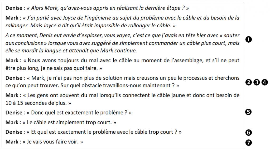 En restant encore plus du côté coaching, elle aurait pu emmener Mark dans cette réflexion en lui demandant, par exemple, « Comment le processus devrait-il se dérouler idéalement ? » ou un peu plus précis « Comment les membres de l’équipe devraient-ils être capables de brancher le câble idéalement ? ».