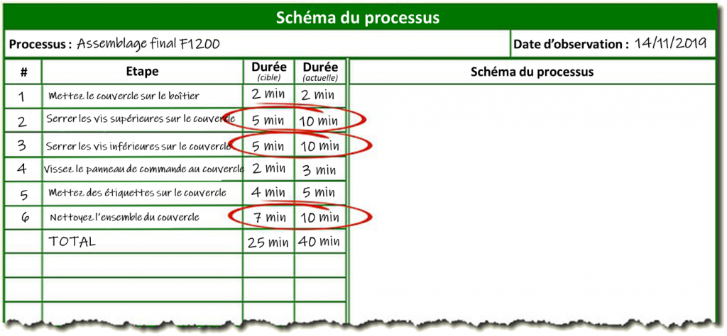 Denise demande à Joe : « Comment allez-vous procéder pour faire l’observation ? » Joe réfléchit un instant avant de répondre « Je vais me concentrer sur cette étape d’assemblage et la regarder pendant que la même personne l’exécute plusieurs fois. » « Et que voudriez-vous observer exactement ? » continue Denise. « J’aimerais observer quelles étapes la personne effectue et combien de temps chacune d’elles prend. »