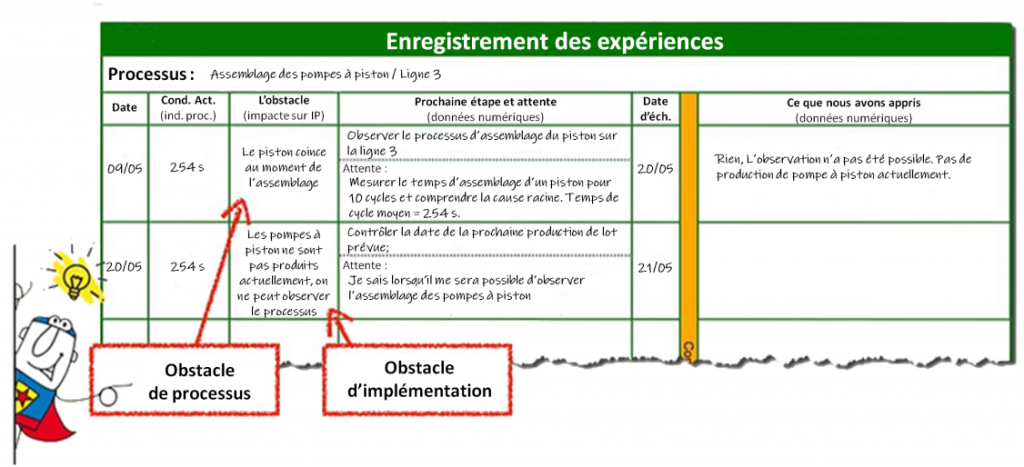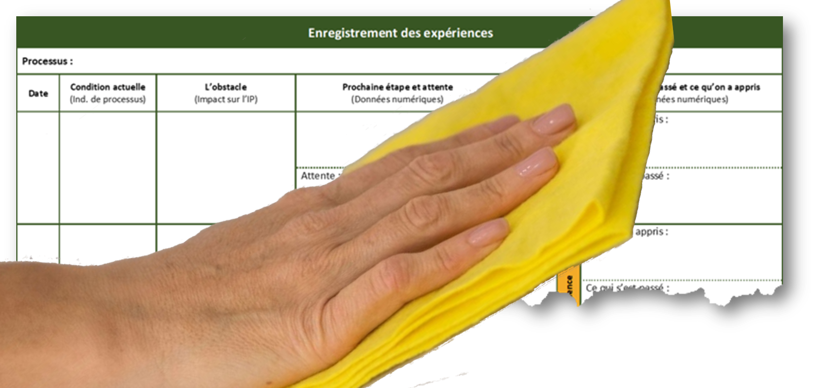 Peut-être serait-il préférable d’utiliser un enregistrement des expériences distinct pour chaque obstacle du processus. Denise continue à réfléchir. À l’avenir, nous noterons des étapes pour surmonter un obstacle à la mise en œuvre, comme celui qui s’est produit ce matin, sur l’enregistrement des expériences. Néanmoins, l’obstacle dans la colonne d’obstacles serait l’obstacle de processus sur lequel nous travaillons actuellement.