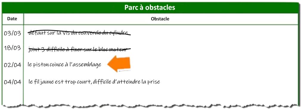 De plus, le parc à obstacles doit être plus concis ; pense-elle. À l’avenir, nous n’écrirons que les obstacles liés au processus. En outre, nous devrions supprimer les obstacles que nous avons réussi à éliminer et marquer l’obstacle de processus sur lequel nous travaillons actuellement. Peut-être avec une flèche collante, décide Denise.