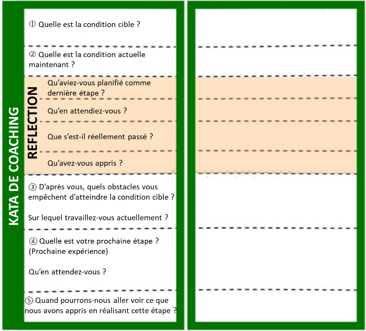 Jason continue. « Il y a quelque temps, vous m’avez parlé des 5 phases d’un cycle de coaching. Chaque question du kata de coaching ouvre une phase de la conversation et constitue un point de passage qualité (voir article 1). En tant que coach, nous ne devrions passer à la phase suivante que si la réponse à la « question du point de passage » est suffisamment précise.