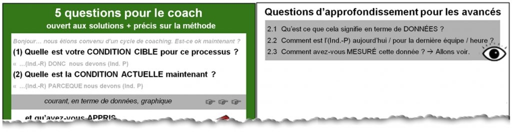 « J’utilise les cinq questions du kata de coaching depuis un bon moment maintenant et je me sens assez à l’aise avec elles », déclare Jason. « Cependant, j’ai l’impression que les cinq questions ne suffisent pas. » « Que voulez-vous dire exactement ? » Denise veut savoir.