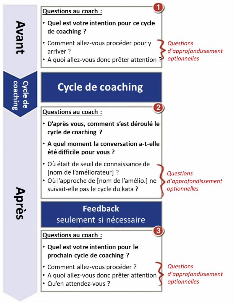 En tant que second coach, nous avons tendance à donner seulement des feedbacks. Ne devrions-nous pas être également coachés ? N’est-ce pas ce que signifie second coach ? Coacher le coach. Peut-être pourrions-nous commencer par poser quelques questions avant et après avoir observé le cycle de coaching.