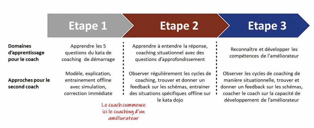 Un coach dans la deuxième phase d’apprentissage était capable de suivre le modèle du kata de coaching. À ce stade, les coaches ont davantage écouté la réponse des améliorateurs et ont commencé à juger si les réponses n’étaient pas assez précises ou si l’améliorateur sautait aux conclusions ou faisait des hypothèses. Le défi à ce stade était d’apprendre à réagir à des situations comme celle-là. Surtout avec des questions d’approfondissement. À ce stade, un coach aurait besoin d’un second coach expérimenté qui observait régulièrement leurs cycles de coaching et donnait un feedback après pensa Denise. Ou encore mieux, pourrait-il y avoir un moyen de former à des situations spécifiques et dans des domaines d’apprentissage individuels avec chaque coach réfléchi Denise.