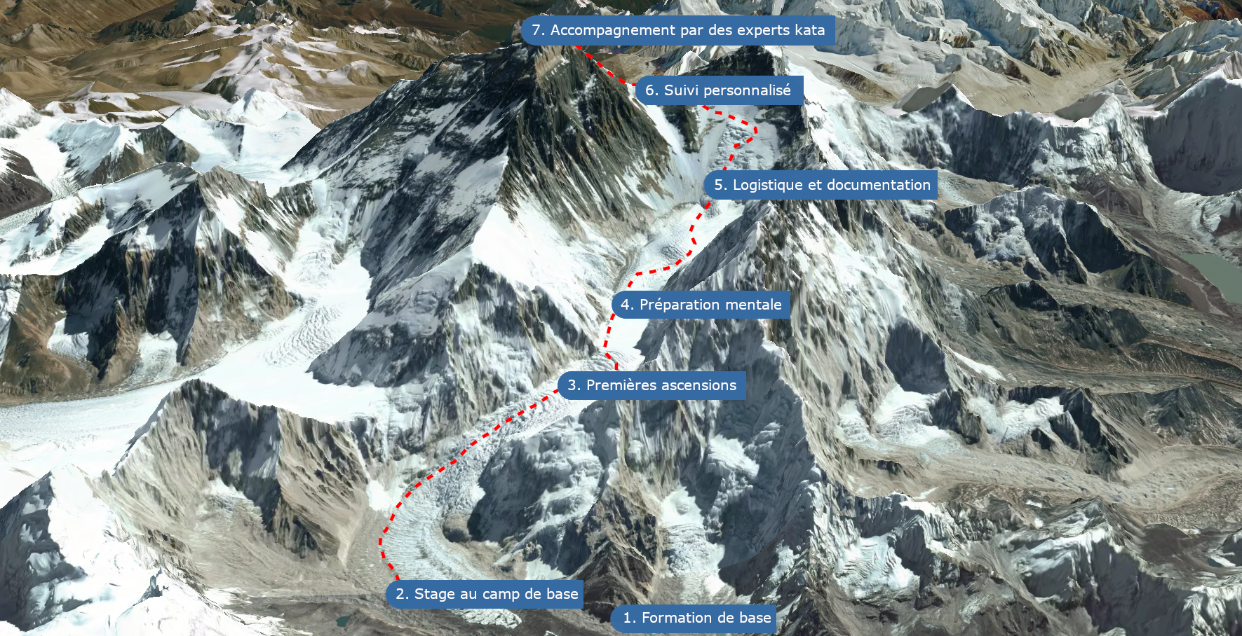 Chaque étape vous rapproche de votre objectif final : avoir une équipe prête à atteindre vos sommets, grâce à l’encadrement bienveillant d’experts en kata.
